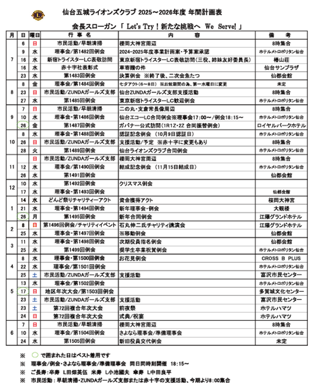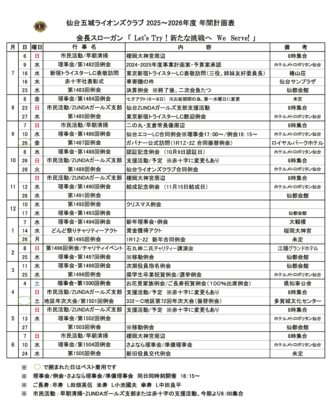 仙台五城ライオンズクラブ 2025〜26年度 年間計画表